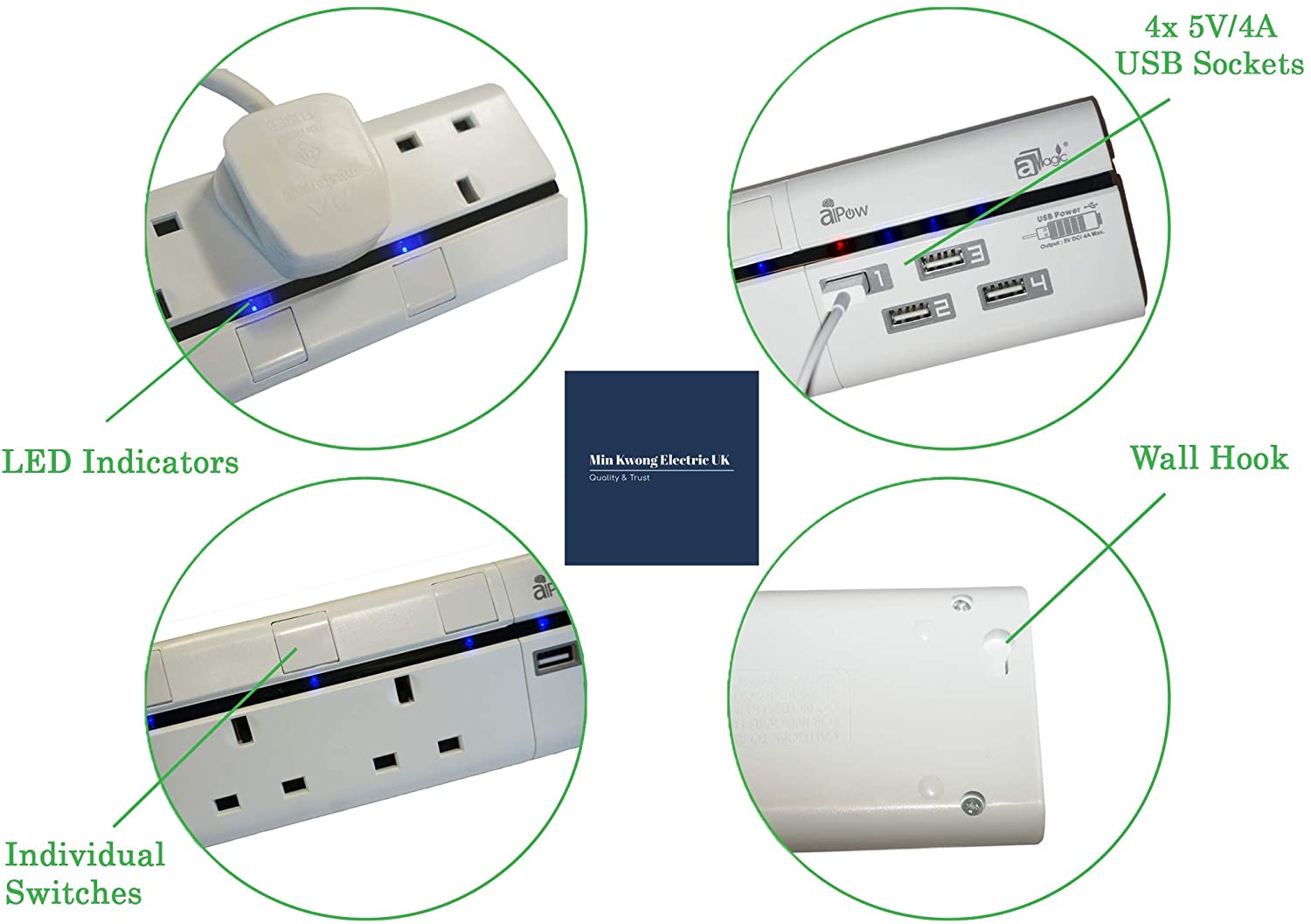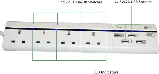 4 USB Charging Ports (5V/4A, 20W max) with LED indicator